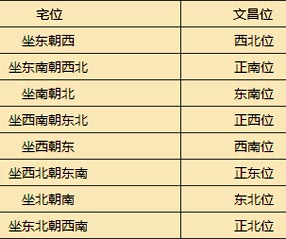 举一个简单例子,假如你的住宅坐向是“坐西北,向东南”,文昌位则在正东位。以下是其它坐向的推算: