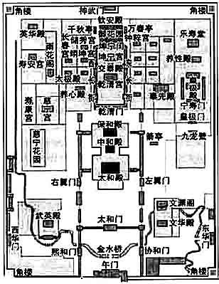 后三宫——乾清宫、交泰殿、坤宁宫为"内廷",是封建帝王与后妃居住之所。两翼为东六宫、西六宫、养心殿、毓庆宫,等等,后有御花园。