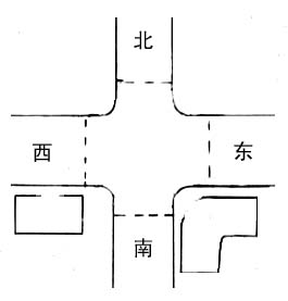 有一位学员画了一个图给黄老师,意思是想让我看看风水。这个是他们当地东西向与南北向两条街道交会的十字路口街道,东西街道上有两个大酒店,它们在街道同一侧,一个在十字街口上,门朝十字街口开着,一个稍离十字街口,门朝街对面(如上图所示)。