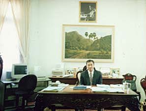 应金边市第一副市长的要求,黄老师2001年9月25日晚飞抵金边看风水。26日金边毛经理用车送我们去市政府,通过秘书处我们到了此副市长办公室,他非常高兴,通过翻译,自我作了一番介绍后,黄老师审视其办公室。